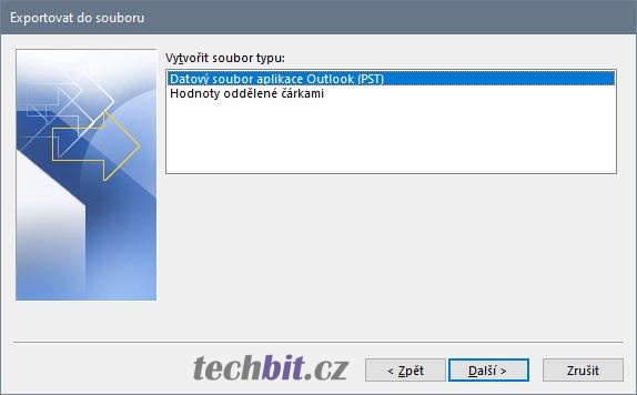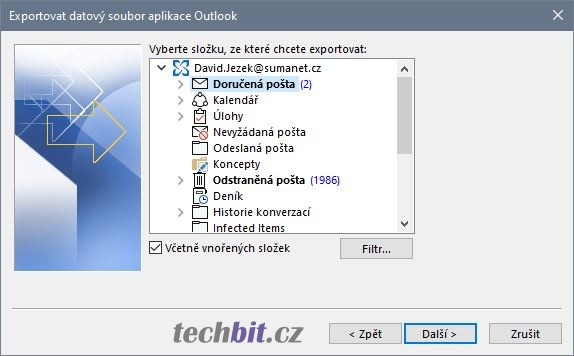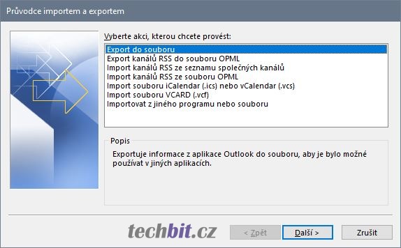 Vybrat akci Export do souboru a pokračovat tlačítkem Další. Vytvořit soubor typu Datový soubor aplikace Outlook (PST) a pokračovat Další. Dále vybrat jaká data se budou exportovat. Možné je zvolit celý mailbox (emaily, včetně kontaktů, kalendáře, úkolů, ..) nebo jen jednotlivé složky. Lze také využít filtr pro export jednotlivých položek. Vybrat umístění nového souboru a možnosti exportu a pokračovat tlačítkem Dokončit. Heslo k datovému souboru je volitelné, je možné nechat ho prázdné. Pak následuje spuštění exportu. Pokud složky pro export obsahují velké množství dat, může akce trvat delší dobu. Po dokončení exportu najdete na vybraném místě nový datový soubor aplikace Outlook, který můžete zálohovat.